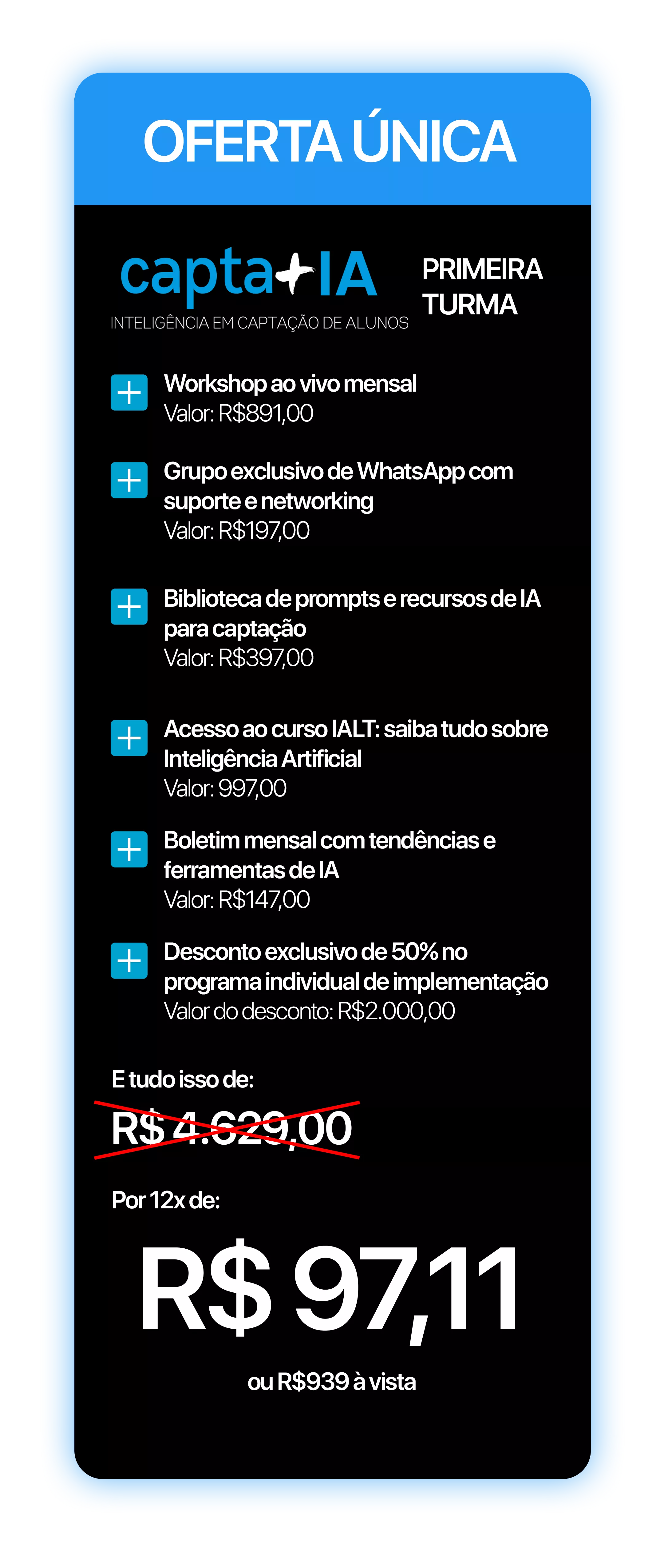 Você tem 7 dias pra explorar tudo, aplicar as estratégias e ver se faz sentido pra sua realidade. Enquanto isso, outros gestores já estão ganhando tempo e matrículas com IA. Vai deixar passar?